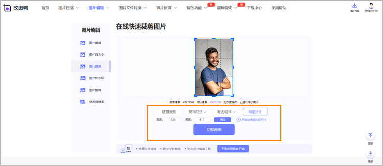 步骤二:点击下方的【指定尺寸】选项,填写你需要的照片宽度和高度,这里我们填的是626*413,确认尺寸后,页面上会出现一个对应尺寸的选择框,用鼠标拖动照片上的选择框,确定好自己想要的照片范围后,点击【立即裁剪】即可。
