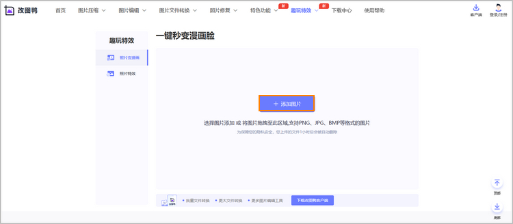 步骤一:点击上方超链或复制链接地址,粘贴到浏览器中并打开该功能页面,点击功能页面的【添加图片】按钮,将需要添加漫画特效的图片导入。