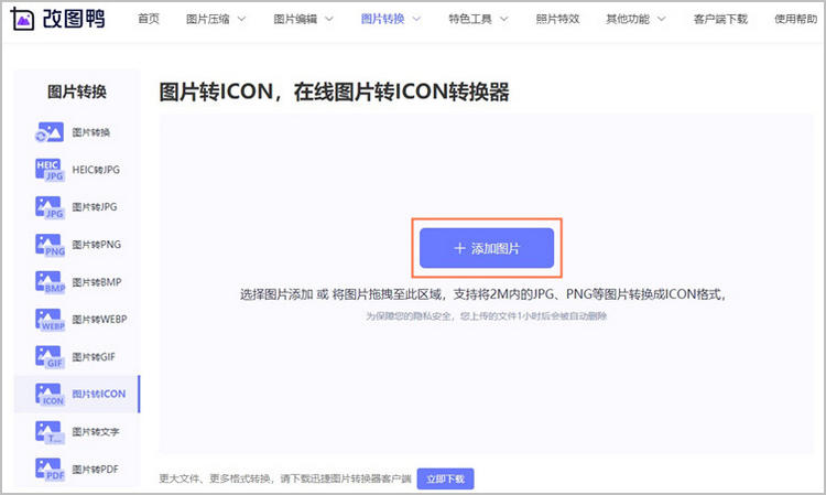 步骤一:我们先打开改图鸭网站,在其主页菜单栏的“其他功能”栏中找到“图片转icon”功能。在跳转的新页面点击“添加图片”按键,上传jpg、jpeg、png等格式图片。